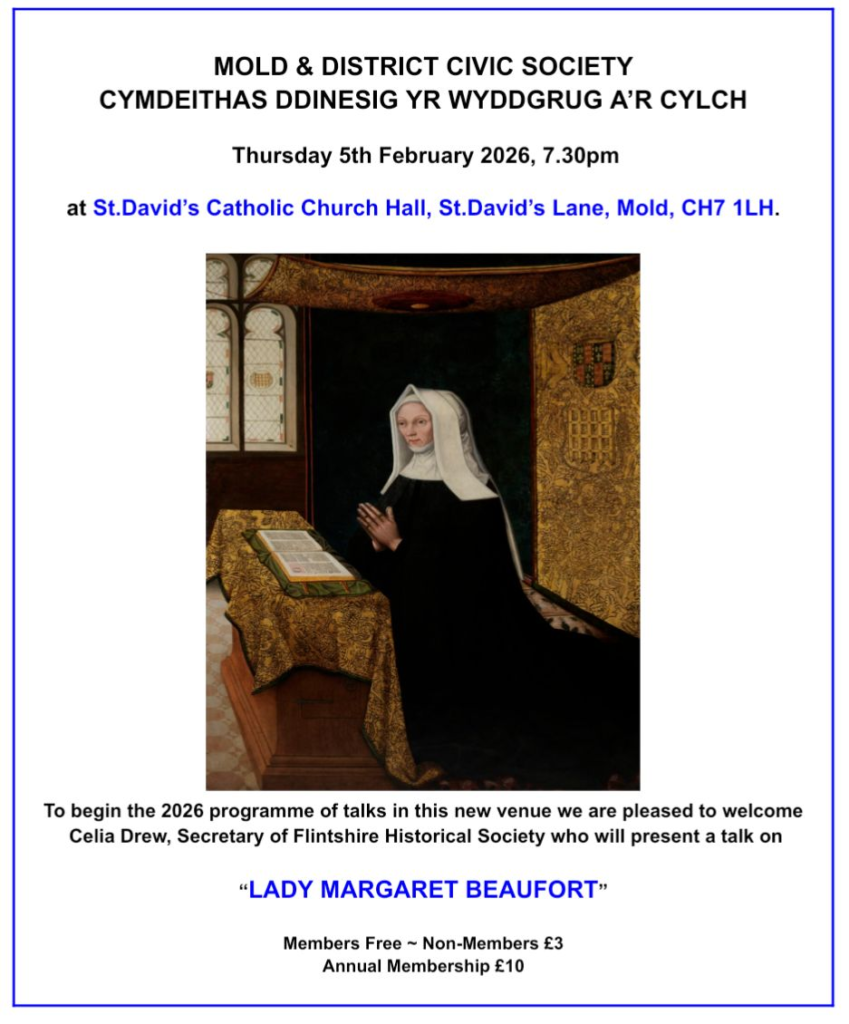 The full 2026 programme of Mold & District Civic Society history talks will soon be available, but here is notice of our first of the year. Please note the 𝗖𝗛𝗔𝗡𝗚𝗘 𝗢𝗙 𝗩𝗘𝗡𝗨𝗘, we will now meet at St.David’s Church Hall in Mold. There is plenty of parking space on site and the hall is easily accessed. We are joined by Celia Drew, the Secretary of Flintshire Historical Society, who will give a talk on Lady Margaret Beaufort the mother of King Henry VII who had links with Mold.